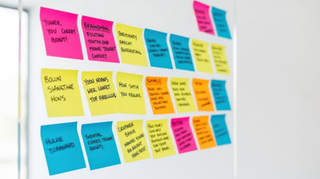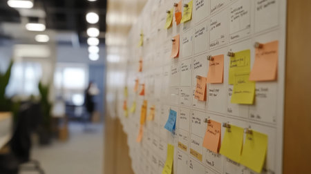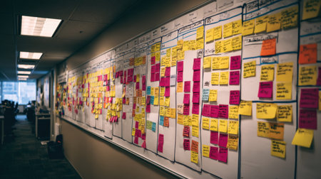 A vibrant display of sticky notes in a modern office, highlighting collaboration and planning efforts. This image captures the essence of teamwork and creativity in project management.