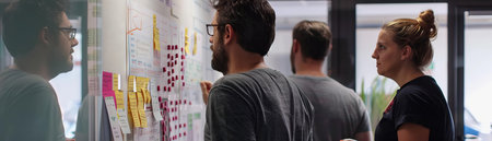 Colleagues gather for a brainstorming session, reviewing ideas on post-it notes in an office