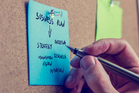 Retro style image of a businessman writing a business plan on a blue sheet of paper