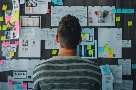 A man in a casual shirt stands in front of a whiteboard covered in sticky notes, thoughtfully reviewing the information. The notes are colorful and cover the entire board, suggesting a brainstorming session or a project in progress. The man's focused expression indicates his deep engagement with the ideas.