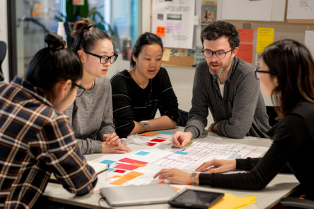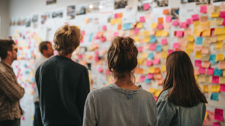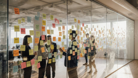 Team collaborates on project planning using colorful notes in a modern office space during a brainstorming session