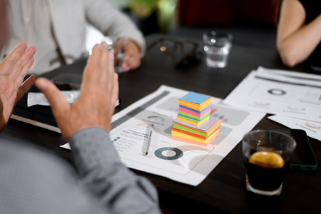 Business meeting focused on strategy development with colorful notes and charts on the table