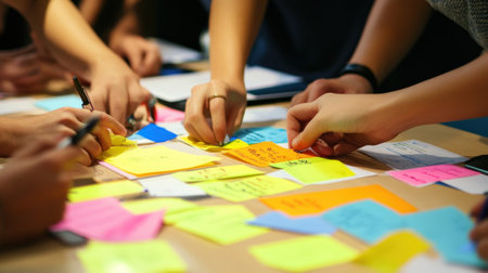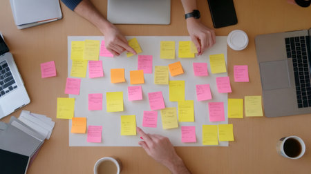 Team collaborating on a project, surrounded by colorful sticky notes and laptops. Hands actively organizing tasks, reflecting multitasking and time management in a busy work environment