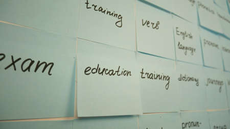 Learning english tags on stickers. Education exam, blue adhesive sticky