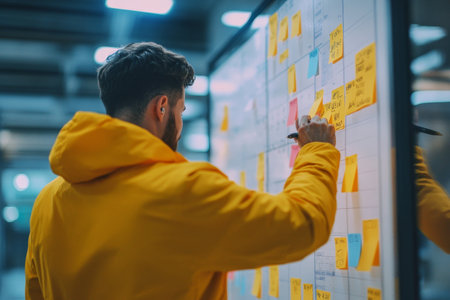 Man in yellow jacket collaborating on event planning with sticky notes in modern office setting