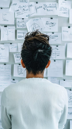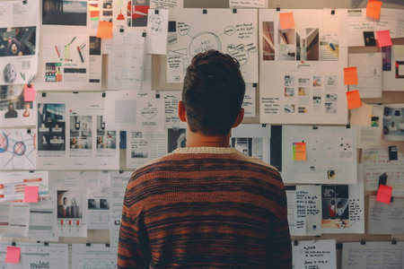 A person looking at a wall covered in papers, possibly brainstorming or planning.