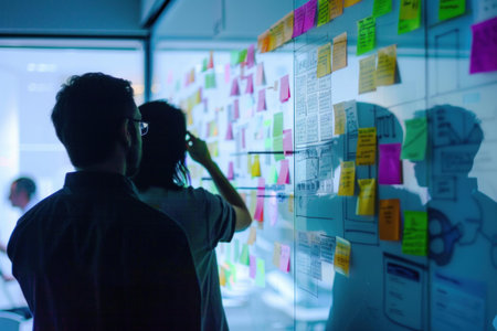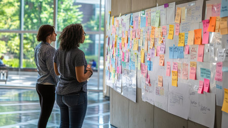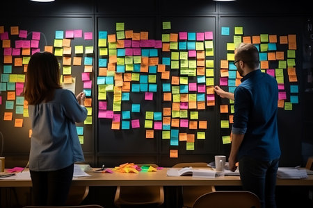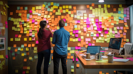Two professionals discuss and analyze colorful sticky notes on a wall in a modern office. The vibrant brainstorming session reflects teamwork and innovative ideas.