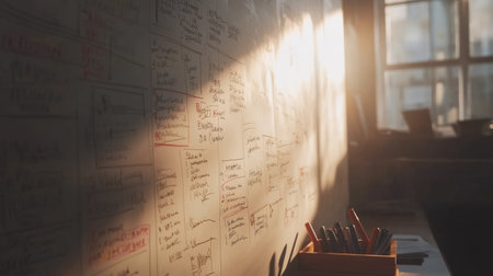 Whiteboard filled with notes and diagrams, markers in tray, and sunlight filtering through the window