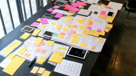 Brainstorming table filled with sticky notes, flowcharts, and digital tablets in use