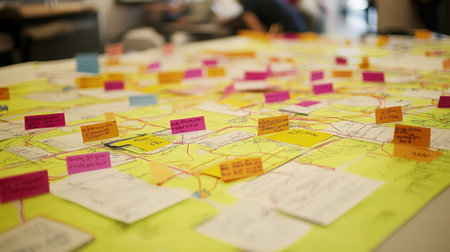A close-up of an urban map adorned with colorful sticky notes, representing key locations for effective planning and creative collaboration in a professional setting.