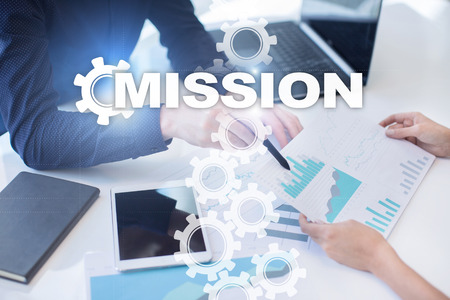 Mission, word in wooden alphabet letters isolated on purple background with copy space