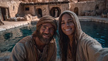 Happy couple in traditional clothing, posing by tranquil water with ancient buildings in the background, creating a warm and inviting atmosphere