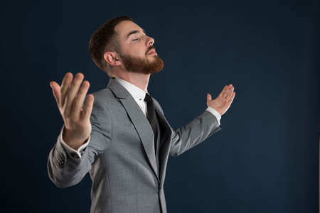 Young businessman raising his arms to the sky wearing a grey suit and black tie