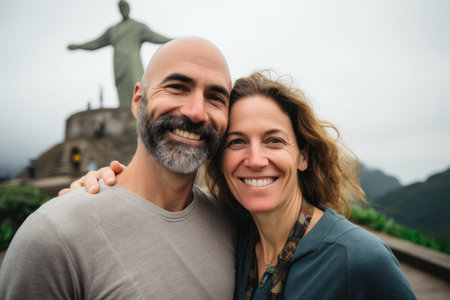 Portrait of a happy couple on the background of the statue of Christ the Redeemer