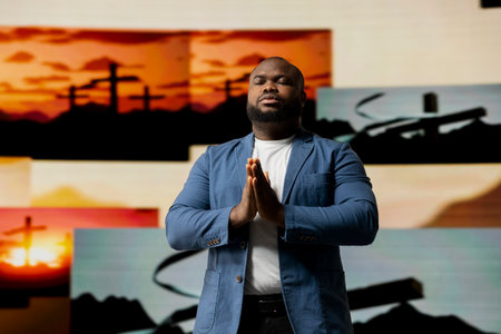 Spiritual man meditates on faith and holiness in a pose of worship and surrender, praise the Lord. The background of crosses symbolizes religion and the higher power of devotion.