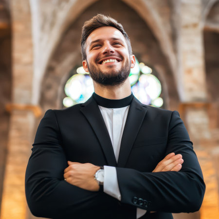 A man dressed in a suit stands confidently inside a church showcasing a joyful smile while surrounded by stunning architecture.