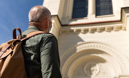 Rear view of man tourist taking off face mask outdoors in city, sightseeing.