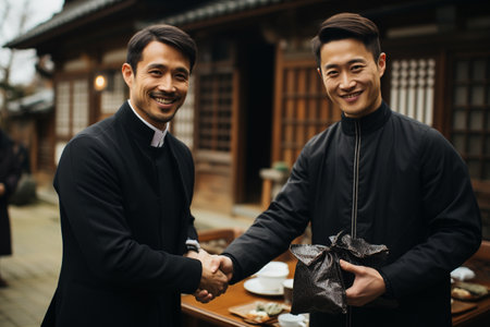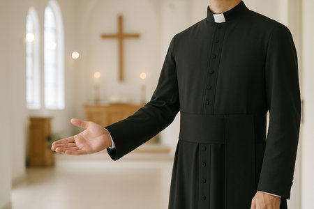 AI generated A compassionate priest stands at the frame edge gesturing invitingly toward a beautiful Christian church interior The scene conveys spirituality faith and community for religious worship