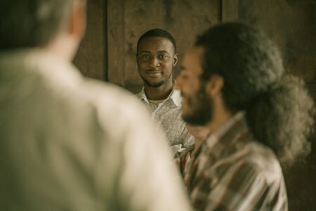 Group Of Office Workers Communicates During A Break While Standing In Office, Focus On Charming Smiling African Guy Thoughtfully Listening To His Colegs, Standing In Blurred Foreground