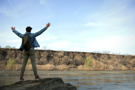 A lone hiker stands on a rock, arms outstretched towards a wide expanse of water and rocky terrain under a cloudy sky.