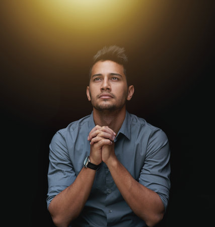 Asking for divine intervention. a handsome young businessman sitting with his hands together against a black background.
