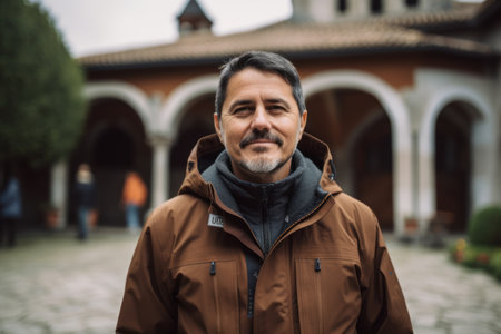 Portrait of a middle-aged man in the courtyard of a medieval castle