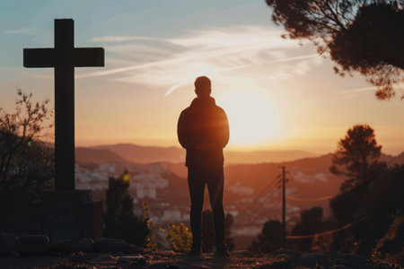 Silhouette of praying man at hilltop cross with warm glow of a sunset. Hope for salvation, request for help to heaven. Concept of faith in God