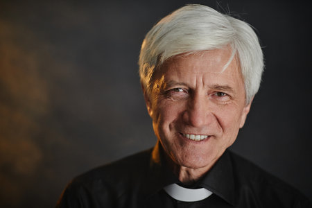 Close up portrait of white haired senior priest looking at camera with smile, copy space