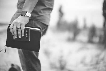 A grayscale selective closeup shot of a person holding a black thick notebook and passport