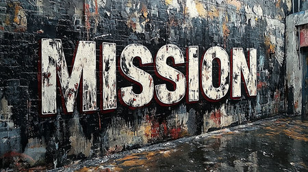 The word 'MISSION' is prominently featured on a textured grunge wall, reflecting a bold and artistic urban design. The distressed lettering adds an edgy, impactful visual statement.