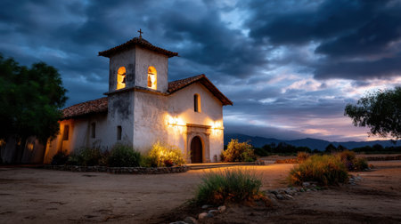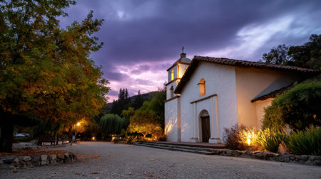 A charming chapel set in a tranquil landscape during dusk, with dramatic skies and warm lights. Perfect for themes of spirituality and nature's beauty.