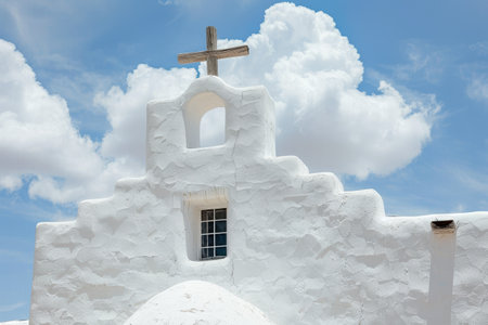 The church features a distinct whitewashed exterior and a wooden cross perched on top, set against a vibrant blue sky filled with fluffy clouds.