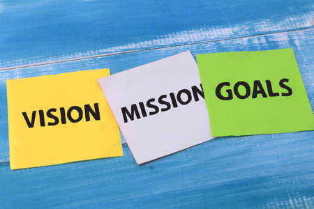 Vision Mission Goals, text words typography written on paper against wooden background, life and business motivational inspirational concept