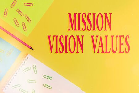 Text sign showing Mission Vision Values. Business photo showcasing company business profile goal and care statement Blank paper sheets message pencil clips binders plain colored background