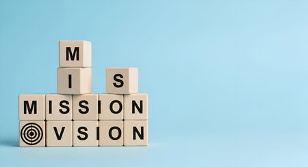 Wooden blocks are arranged to spell out MISSION and VISION. One block features a target with concentric circles, representing a goal or bullseye. The blocks are placed on a light blue background, suggesting a business or strategic concept.