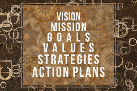 Vision, Mission, Goals, Values, Strategies & Action Plans, abstract business conceptual words with brown texture as background for web page, graphic design, catalog or wallpaper.