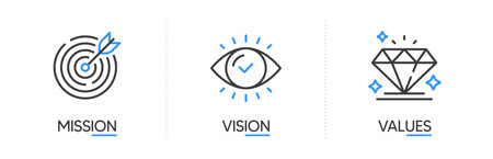 Mission, vision, values icons, business concept of corporate goals, vector line symbol. Company strategy of mission, vision and values target in diamond, eye and aim target linear signs