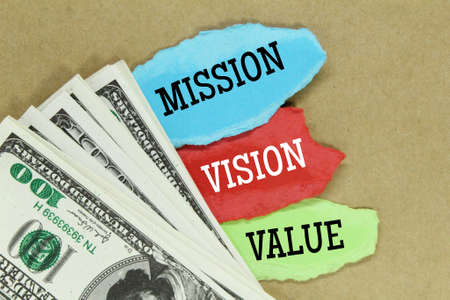 banknotes and torn paper with the words Mission, Vision and Value