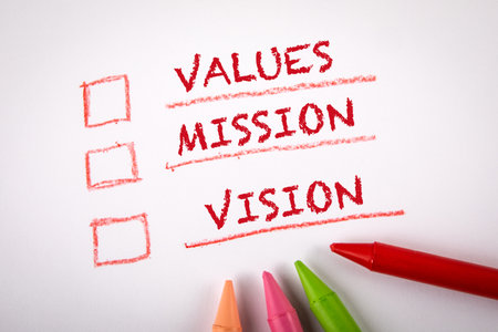 Values, Mission and Vision. Checklist and colored crayons on a white sheet of paper