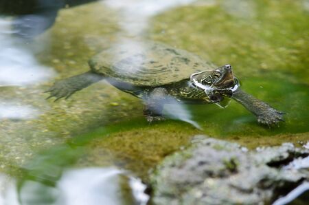 Painted Turtle Chrysemys picta with algae growing on its carapace swimming in a lake in Vermont during the Summer