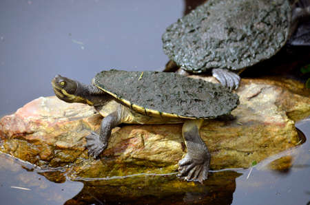 Aquatic turtle drying its shell at the waterside