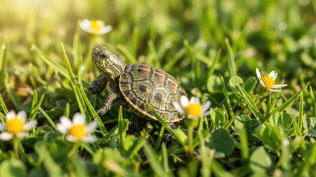 A small turtle navigates through lush green grass dotted with delicate white flowers. The scene is illuminated by warm sunlight, casting soft shadows. The overall composition suggests a natural outdoor setting, potentially suitable for various visual communication projects or editorial purposes.