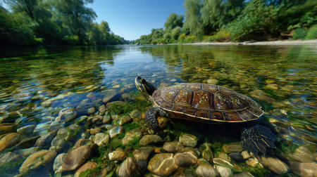 A turtle is seen swimming in clear, shallow water. The image presents a vibrant, natural scene with a focus on aquatic life. Lush green vegetation lines the riverbanks under a bright blue sky. This photograph can be used for environmental, wildlife, or nature-related content.