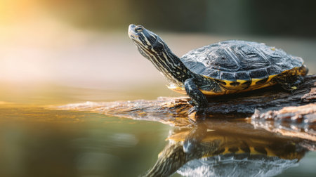 A stunning turtle basks on a sunlit log, reflecting in the calm water of a serene pond, showcasing the beauty of nature and wildlife.