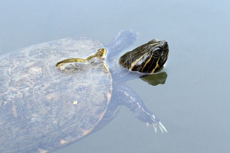 Turtle swimming in the pond during a sunny day. Taken in Wascana Waterflowl Park Display Ponds, Regina, Saskatchewan, Canada.