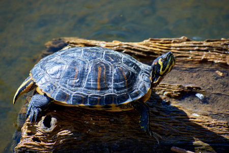 Red Eared Terrapin - Trachemys scripta elegans. Red eared slider turtle in the summer sunlight.