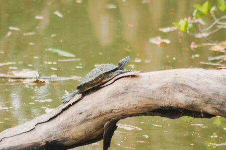 Lake turtle chilling on the broken tree in lake