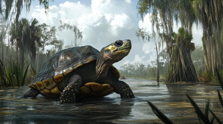 A serene scene showcasing a majestic turtle gracefully navigating through a tranquil swamp landscape. Lush greenery and bright sky add to the peaceful ambiance.