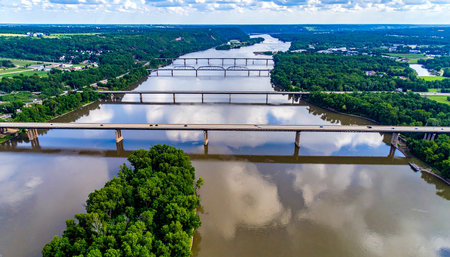Aerial view of the Mississippi River winding through lush landscapes, ample space for copy