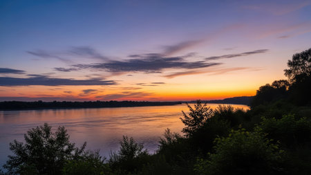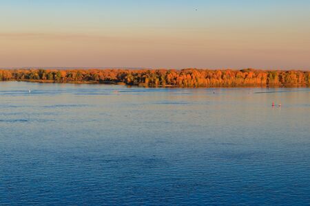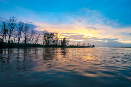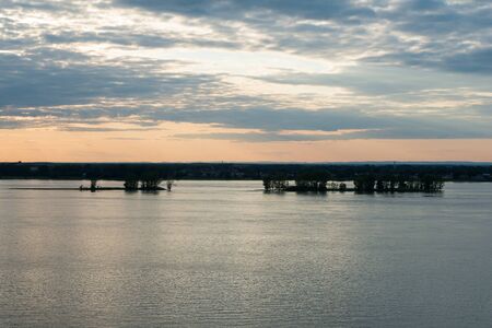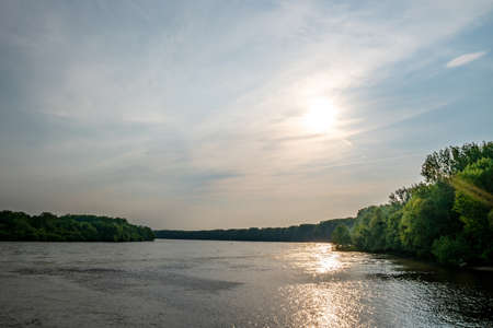 Summer landscape of the river. Sunrise sunset. every day on planet Earth can begin serene with the rising of the sun, when the sky gently brightens over the golden eastern horizon.
